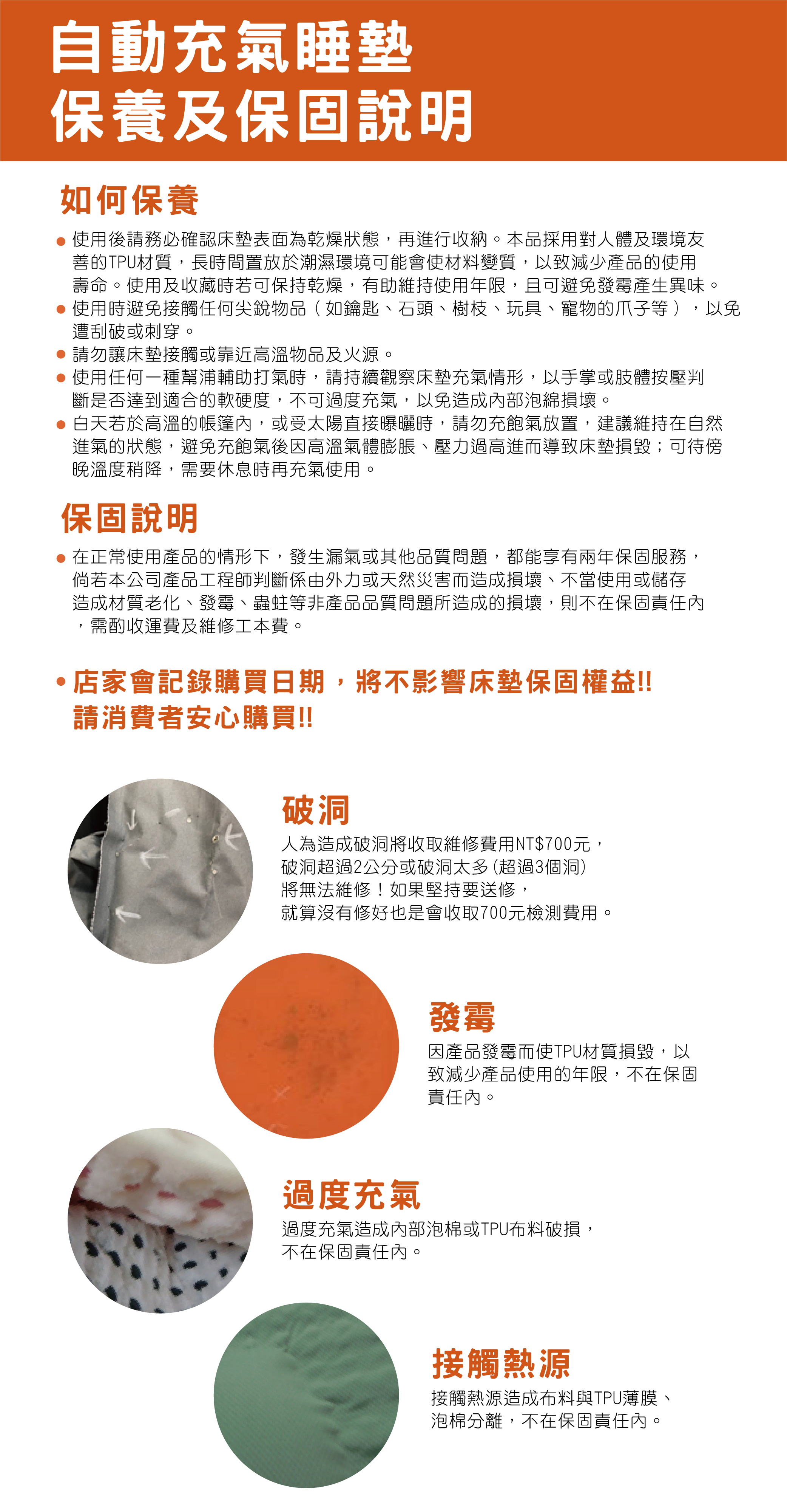 自動充氣床墊 品質安心/台灣製造 TPU無毒材質製造,不用擔心塑化劑 氣嘴自動進氣,加快充氣可使用打氣機,操作簡易 保固期:18個月· ●經銷商於保固期注意事項如下: 1.保固日啟始計算期需於床墊生產日後4 個月內銷貨日 起算.請各經銷商依需求量 叫貨,避免囤貨而造成超過 保固期之情 形。 2.生產日印製於床墊側邊